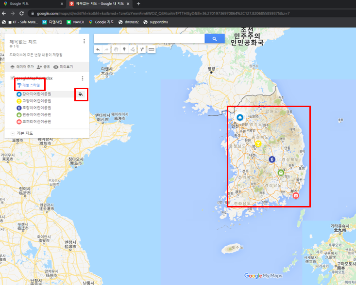 업로드가 완료되면 위 그림과 같이 엑셀에 있던 위경도 값이 자동으로 구글 맵에 올라간 것을 확인할 수 있습니다.