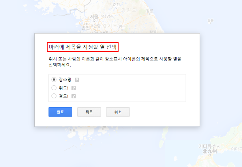 엑셀 내의 "경도!" 컬럼을 경도 값으로 선택 후 계속