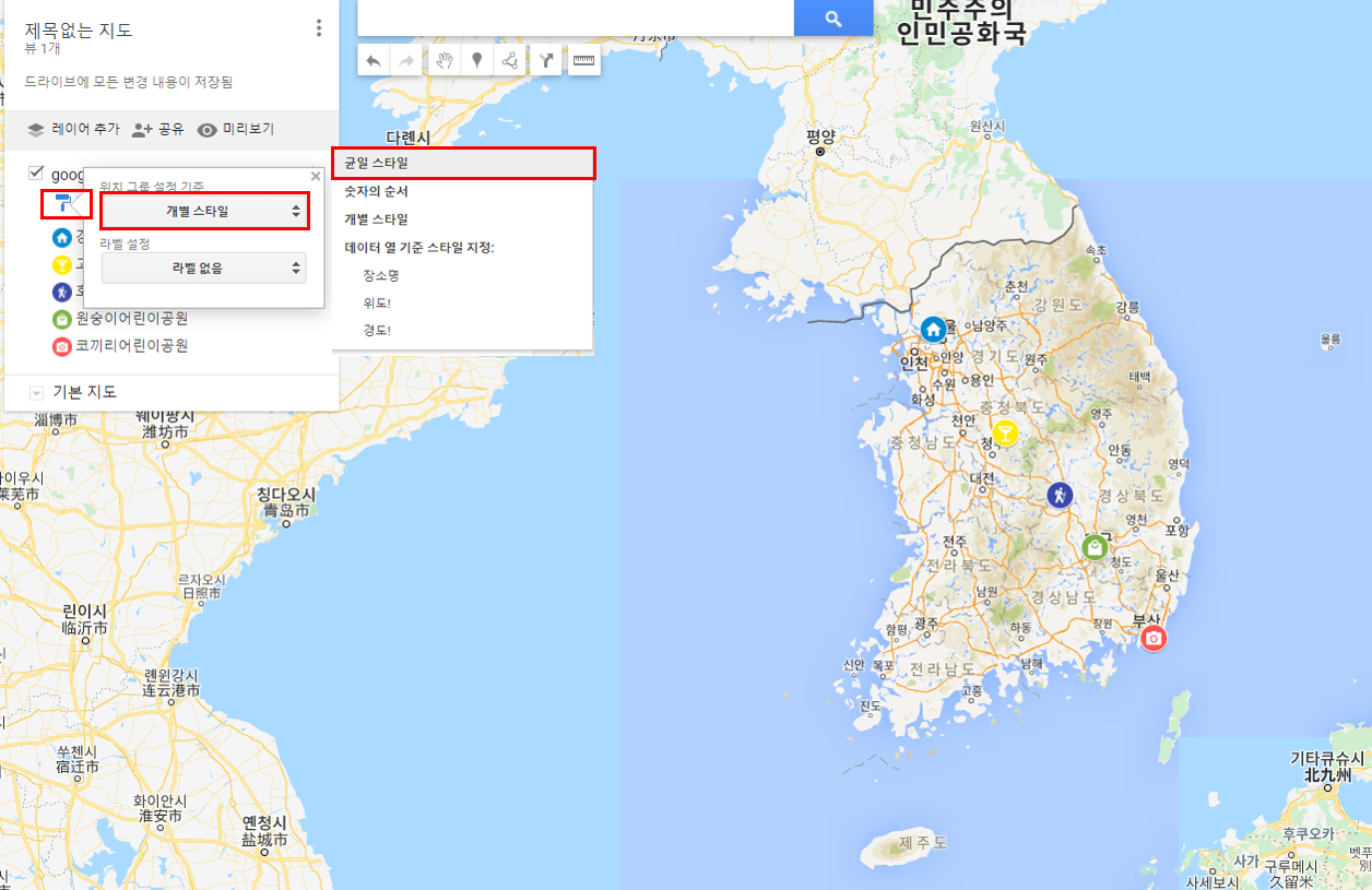 "개별 스타일" 인 상태에서는 장소 별로 마커 모양을 달리할 수도 있고,