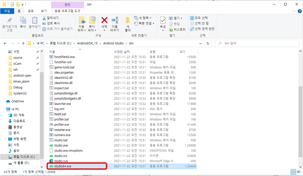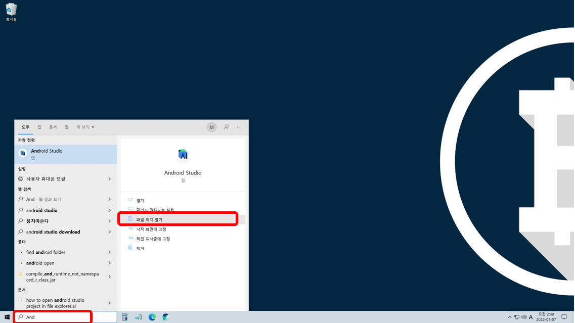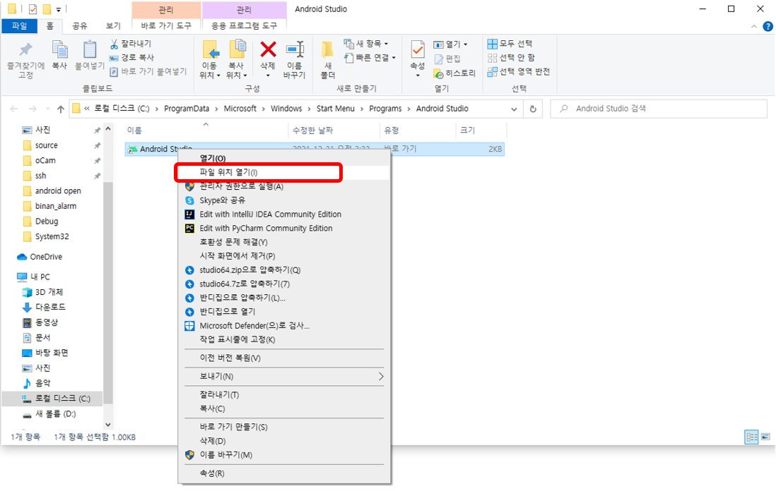 작업표시줄 검색기 - Android Studio 검색 - 파일 위치 열기 클릭