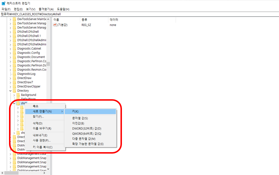 경로 : HKEY_CLASSES_ROOT - Directory - shell