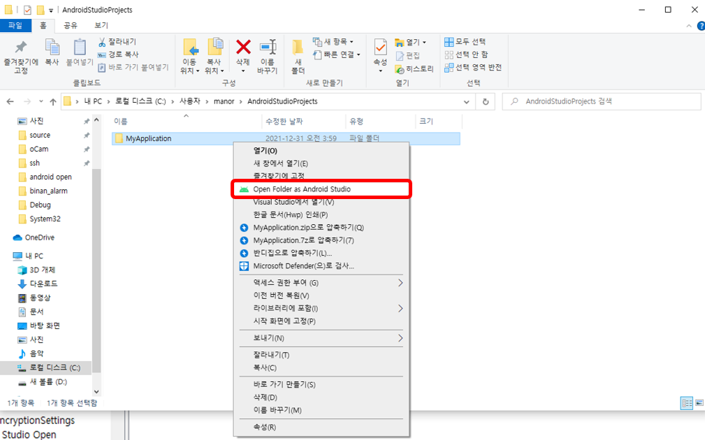 위 사진과 같이 프로젝트 폴더를 마우스 우클릭하여 안드로이드 스튜디오로 바로 열 수 있도록 하는 것.