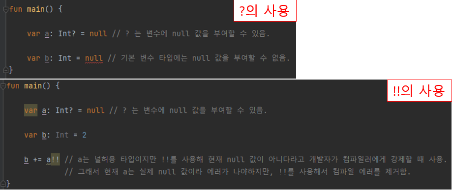 아래 그림처럼 a 변수의 실제 값은 null 이 아니여도 널허용변수와 널불허용변수의 연산으로 인해 생길 수 있는 NPE(NullPointerException) 를 방지하기 위해 컴파일 에러가 납니다.