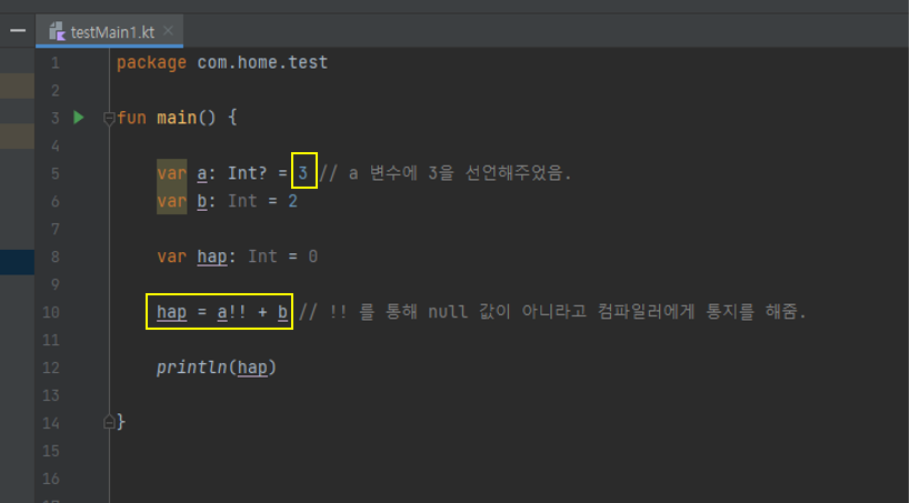 널 허용 변수타입(Int?)과 널 불허용 변수타입(Int)을 더하려고 하니 아래처럼 컴파일 에러가 납니다.