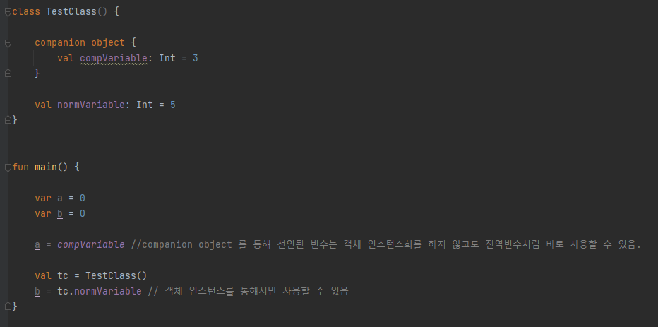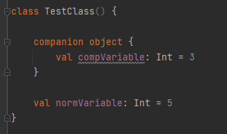 하나(compVariable)는 컴패니언 오브젝트에 의해 감싸져 있고, 하나(normVariable)는 그냥 선언되어 있습니다.