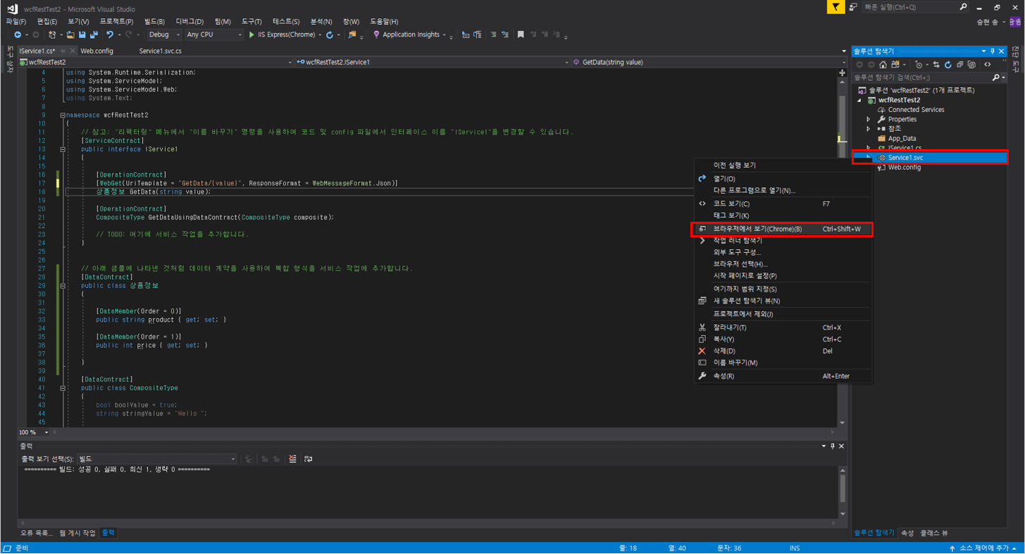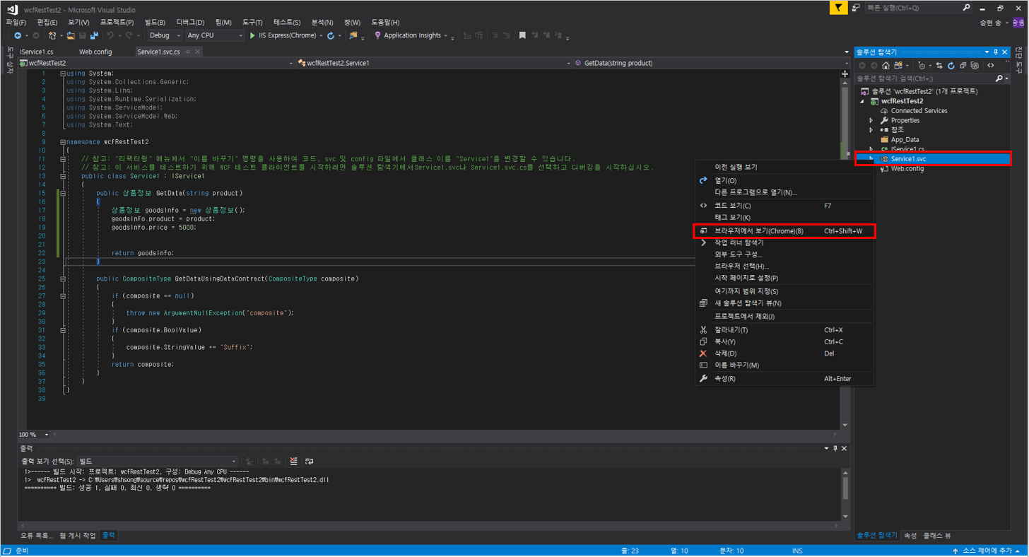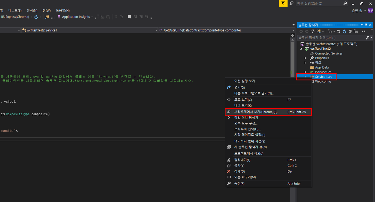 솔루션 탐색기 - Service1.svc 마우스 우클릭 - 브라우저에서 보기 클릭