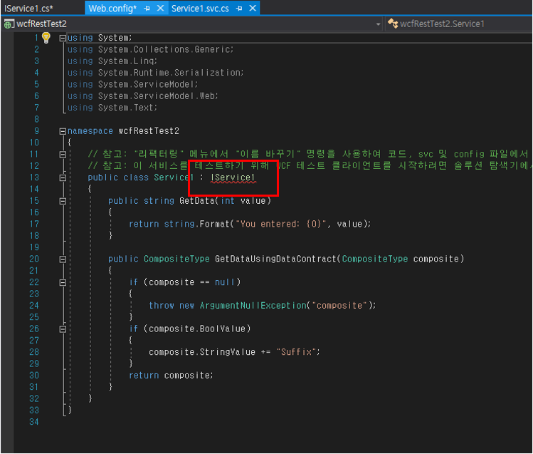 3번 내용대로 IService1.cs 코드를 수정하면 Service1.svc.cs에 아래 그림처럼 코드 오류가 떠있을 겁니다.