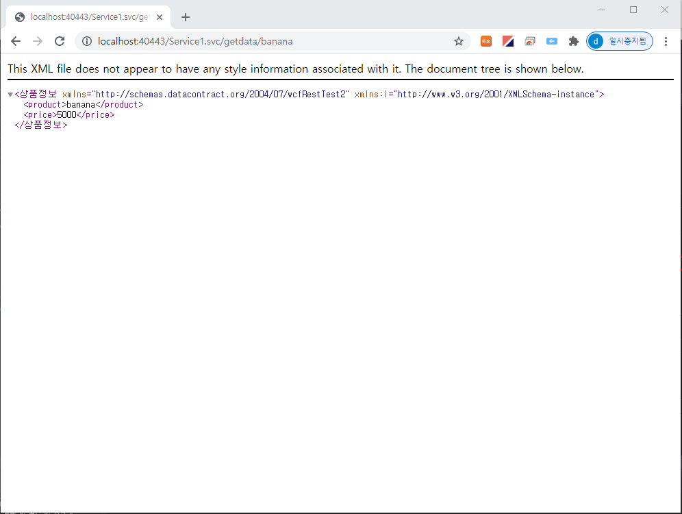 주소창에 http://localhost:40443/Service1.svc/getdata/banana 입력