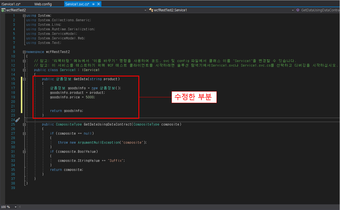 IService.cs 에서 함수 반환 유형이 string에서 우리가 만든 클래스인 '상품정보' 로 변경되었으니